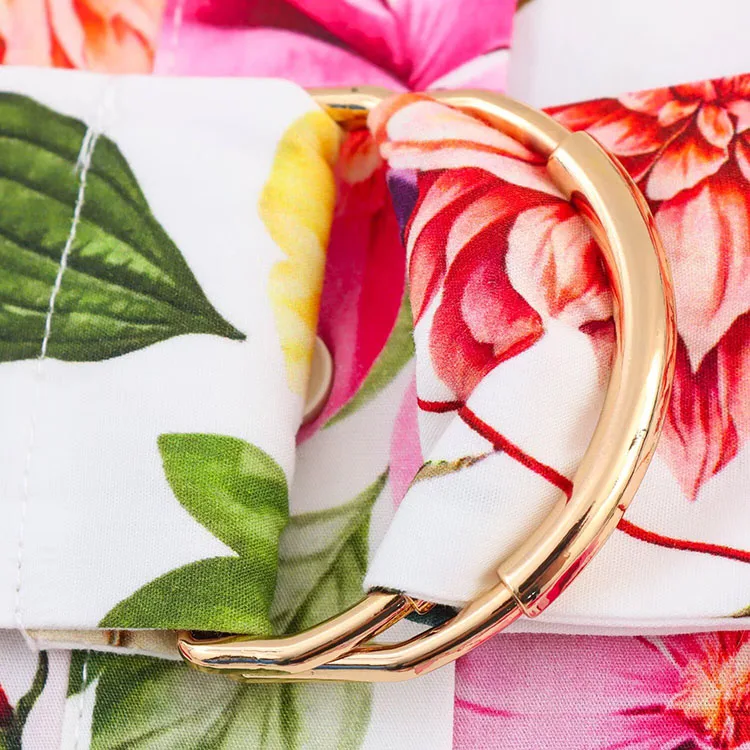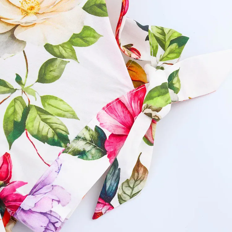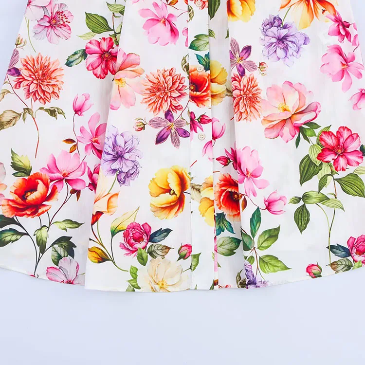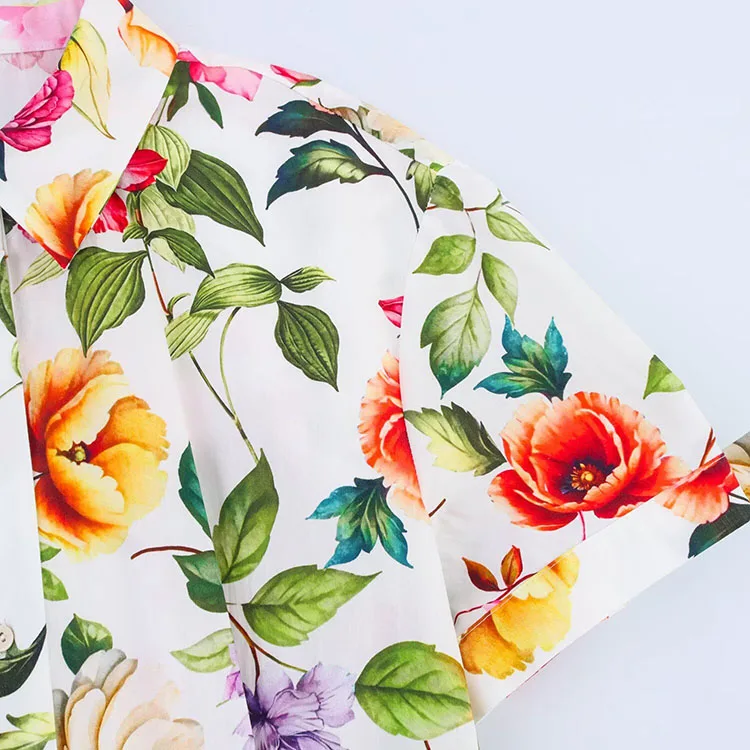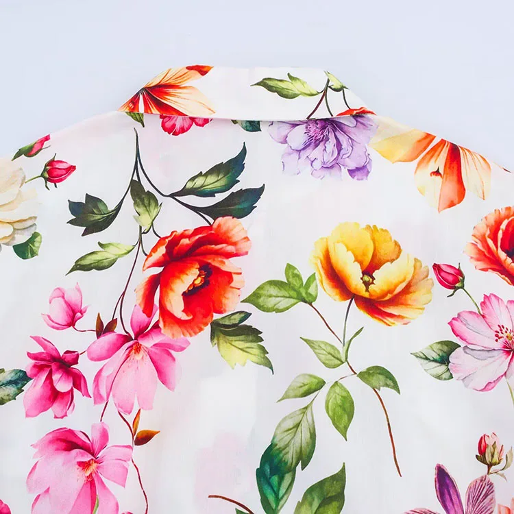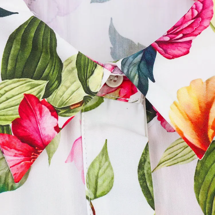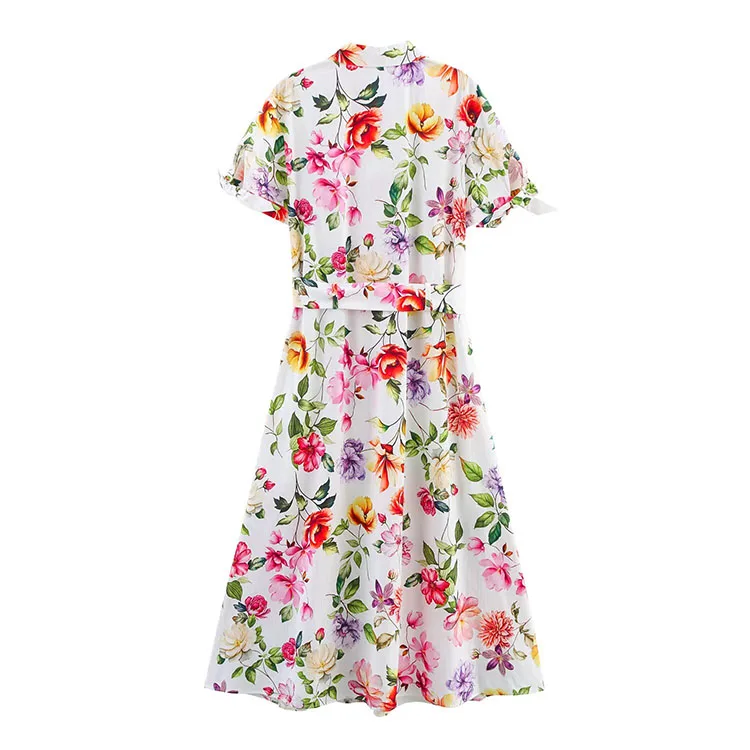 Vestido con cuello solapa y manga corta y lazos. Bolsillos laterales en la costura. Cierre con botón frontal y cinturón a juego.